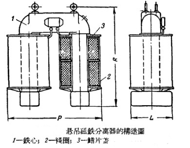 球磨機(jī)運(yùn)轉(zhuǎn)中所用的懸吊磁鐵分離器則主要由一些馬蹄形的鐵心構(gòu)成,其上繞有線(xiàn)圈,而下段裝有的端部。經(jīng)過(guò)此設(shè)備分離出來(lái)的金屬塊會(huì)在人工作用除去,具體結(jié)構(gòu)如下: